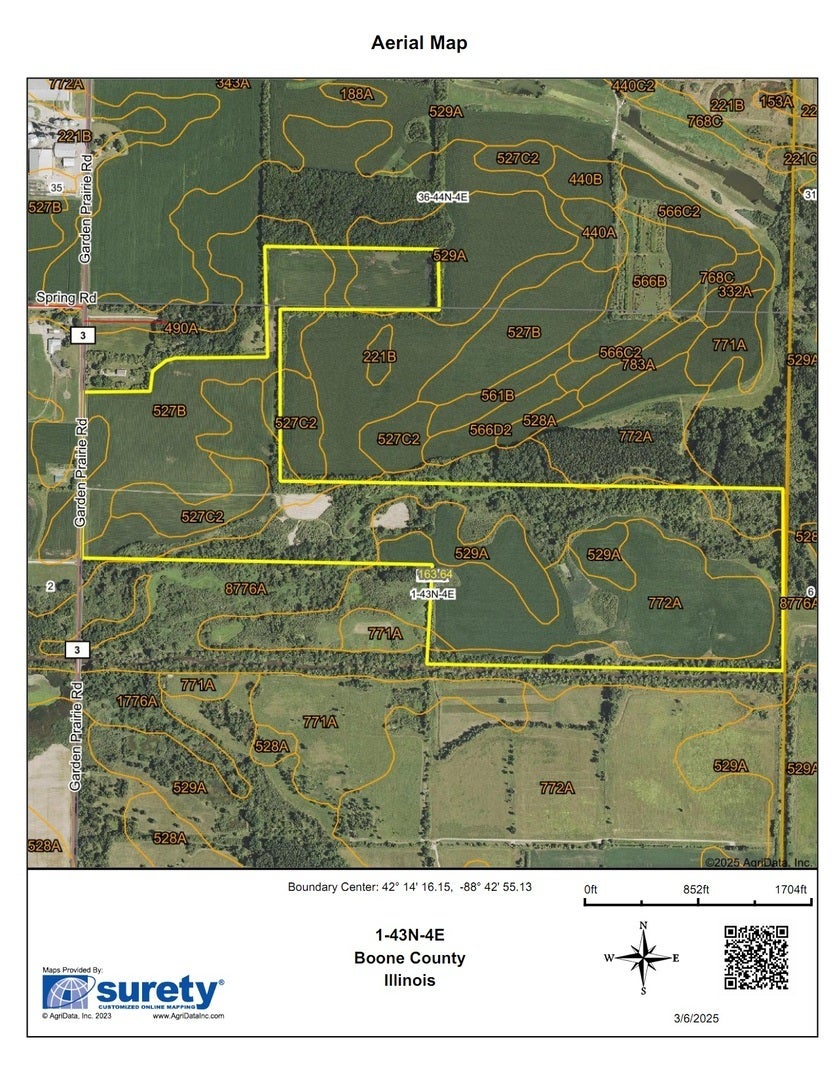 This farm is located near Garden Prairie, between Belvidere and Marengo just South of US Hwy 20. This farm offers approximately 164.63 taxable acres with 110 MOL tillable acres and the balance being wooded. The PI on the tillable land is approximately 121 based on Surety information. This farm is leased for the 2025 crop year. Excellent hunting opportunities. Asking 9,300 per acre.