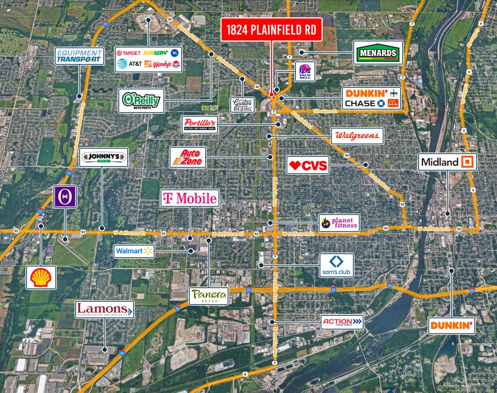 This .67 acre parcel is located in the busy Plainfield Rd. (Rt. 30) business corridor. Nearby businesses are national franchise restaurants and retail outlets. The zoning for this parcel is B-2 that offers a seemingly unlimited array of business opportunities. Please use the drop down box to view the business options that are available. Copy of the survey is in the drop down box. City water, gas and electric are on the lot and currently in use. There is a sewer hook up in the rear of the property. There is a 30'x26' finished garage complete with heat, gas, electric and water to it. The garage once had high capacity electrical service to it. (480V/ 240V/ 120V). The service boxes are still available and the proud new owner can have the electrical service increased. The finished garage may be razed, but would make for a great work shop. The traffic count per the IDOT website is 19,000 vehicles/day. The property is being sold in AS-IS, WHERE-IS condition. The seller has not conducted any environmental testing or formal studies. Prospective buyers are encouraged to conduct their own due diligence.