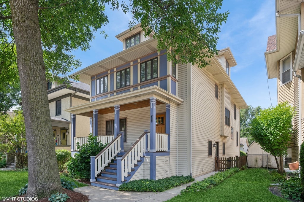 Looking for that perfect walk-to-everything home? This Forest Park home is the one! Located on an oversized lot, this newer construction home offers exceptional space, thoughtful design, and unmatched quality-inside and out. Enjoy charming curb appeal with a welcoming front porch, a large rear deck ideal for entertaining, and a fully fenced yard. Step inside to find hardwood floors throughout the main and second levels, soaring ceiling heights, and sun-filled rooms with large energy efficient windows. The open floor plan includes a formal living room and spacious dining area-ideal for entertaining of any size. Custom trim and woodwork add a refined touch throughout. The chef's kitchen is a true centerpiece, featuring custom cabinetry, stone countertops, a massive island, high-end stainless steel appliances, and an eat-in area. The adjoining family room with a cozy fireplace flows seamlessly to the rear deck-perfect for grilling and outdoor dining. Upstairs, four generously sized bedrooms each offer amazing closet space and en suite or adjoining baths for maximum convenience. The luxurious primary suite is a serene retreat, complete with a spacious bedroom, a custom walk-in closet, and a spa-inspired bath with a double vanity, soaking tub, and walk-in shower. A fully finished third level offers incredible flexibility-ideal for a fifth bedroom, home office, or recreational space. Additional features include zoned heating and cooling, surround sound, a lower level with side entrance, a mudroom, laundry room, and plenty of storage. This meticulously maintained home checks every box in an unbeatable location!