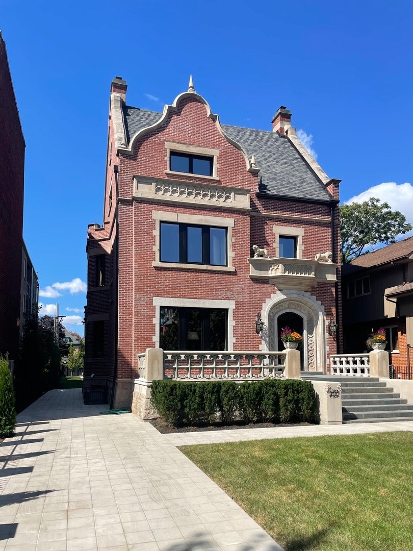A Timeless Treasure in Kenwood - Where History Meets Modern Luxury. After a meticulous two-year renovation, this historic urban estate once again shines in all its grandeur - an extraordinary blend of early 20th-century elegance and contemporary design, nestled on an expansive 50 x 300-foot lot in the heart of the Kenwood Historic District. Originally built in 1904, J.B. Cole's residence was heralded by The Economist as "a picturesque structure in old English style of architecture," complete with ornamental iron doors, a sweeping circular staircase, and finely crafted finishes. Today, this architectural gem has been thoughtfully restored - honoring its storied past while seamlessly integrating the luxuries of modern living. Regal stone lions still guard the original iron doors, which open to a dramatic foyer showcasing a paneled fireplace, built-in seating, and intricate stained glass. A grand, sweeping staircase - illuminated by a period chandelier - sets the tone for the magnificence within. The main floor features reimagined open-concept formal living and dining areas, created by uniting the home's two original parlors. Pocket doors lead to a chef's dream kitchen, outfitted with stainless steel appliances, quartzite countertops, and generous space for banquette seating. French doors open to a sunroom with access to a large deck, overlooking a beautifully landscaped, fully fenced backyard. Upstairs, the curved main staircase (augmented by the original rear servants' stair) leads to a luxurious second floor anchored by the expansive primary suite - a private retreat featuring a custom walk-in closet, a marble-clad spa bath with a steam shower, and a sun-drenched, heated porch with views of the backyard oasis. Two additional bedrooms on this floor each include decorative fireplaces and share a tastefully updated bathroom. The third level offers two generously sized bedrooms, each with custom closets and en-suite baths with steam showers - ideal for guests or family members seeking extra privacy. Wide-plank wood floors and custom windows are found throughout, and the fully finished lower level is a home in itself. Heated with radiant flooring, this level features a spacious family/media room, a large laundry room, a fifth bedroom with walk-in closet, ample storage, and a wine cellar tucked beneath the front porch. Enhancing the property is a Coach House, complete with a four-car garage and a spacious one-bedroom apartment above - perfect for guests, extended family, or additional rental income. Ideally located near the University of Chicago, the Laboratory Schools, and all the dining, shopping, and cultural amenities the community has to offer - this is more than a home; it's a lifestyle. A rare opportunity to own a piece of Kenwood history - exquisitely reimagined for modern living. Welcome home!