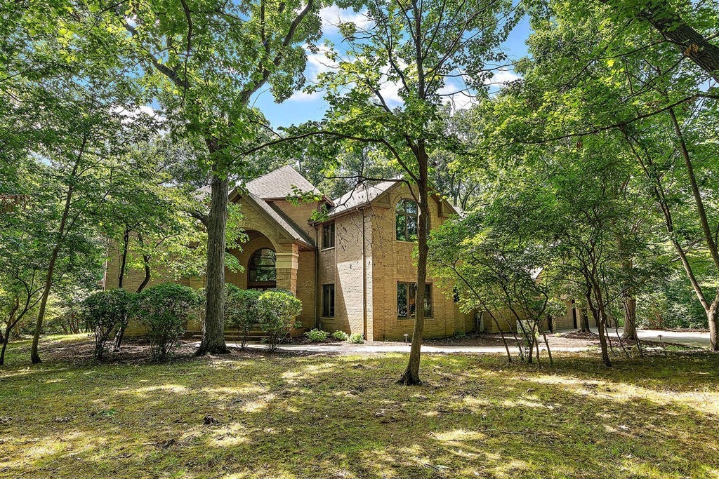 Tucked away on just under an acre in the highly sought-after Butternut Creek Woods-known for its winding roads, mature trees, and custom-built homes-this spectacular all-brick residence offers both peace and prestige. A brick-paved drive and walkway lead to a charming covered front porch, creating a warm and inviting welcome. Inside, the grand double-door entry opens to an impressive two-story family room featuring soaring windows that flood the space with natural light, a cozy fireplace, and a custom wet bar-perfect for relaxing or entertaining. The open-concept kitchen includes granite countertops, stainless steel appliances, and a convenient breakfast bar. The formal living and dining rooms offer an elegant setting for entertaining indoors and hosting larger gatherings. This home is ideal for related living with two master suites, including a luxurious main-floor primary suite that showcases serene views through a wall of windows, a gas fireplace, dual walk-in closets, and a spa-inspired bath with a whirlpool tub, walk-in shower, and dual vanities. A main-level flex room offers space for a home office, library, or guest room. Upstairs, a stunning glass catwalk provides a striking view of the main living area below and leads to four spacious bedrooms-including a second master suite. The finished basement is built for entertaining, complete with a custom wet bar, game room, large family room, and a beautiful masonry brick fireplace. Enjoy peaceful views from the sunroom or the oversized patio that overlooks the spectacular tree-lined yard. A built-in firepit area offers yet another perfect spot for outdoor gatherings. Comfort is key in this home, which features three HVAC systems providing zoned heating and cooling-keeping every level perfectly comfortable year-round. This home truly has it all-style, space, and setting. You will not be disappointed!