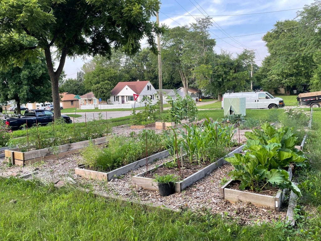 Nice corner lot with a well-established community-style garden. This thoughtfully designed garden features 12 raised beds filled with rich organic soil and compost, ranging from 2x8 to 3x10 feet. Each bed is carefully positioned to maximize growing potential while maintaining an inviting, natural layout. A dedicated flower bed is planted with native flowers to support pollinators, and two young fruit trees offer future harvest potential. We've nurtured this space with a focus on biodiversity-entirely free of spraying, using only organic gardening practices from the start. The garden also includes an established rhubarb bed and an asparagus bed, both in their second year and well on their way to becoming perennial producers.