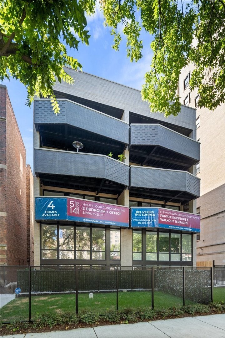 DELIVERING NOW! Introducing 5114 Kenwood - a collection of new construction luxury condominium residences now completed in Hyde Park. Tucked along a quiet, tree-lined, one-way street, 5114 Kenwood delivers the product missing in the neighborhood: single-level contemporary living and light-filled duplex residences - boasting incredible private outdoor living spaces - in an elevator-accessible building with secure parking. Acclaimed developer ZSD, having achieved success with mid-rise developments in West Loop, Lincoln Park, and Noble Square, brings their skillful experience and thoughtful design to Hyde Park. Penthouse B is a stunning half-floor, single-level condo in the building and stretches the length of the top level, with north, west, and east exposures. The elevator delivers residents and guests to a posh foyer and sleek entry. A clean, contemporary aesthetic is carried throughout the home beginning with a massive 19-ft kitchen with flat front cabinetry, large island, pantry closet, and integrated appliances: Bosch dishwasher, Fisher & Paykel refrigerator/freezer, Kitchen-Aid induction range, and externally-vented exhaust hood. The 22-ft wide living room and dining spaces open to a 200 SF east-facing walkout balcony with gas, water, and electric hookups included. Wide-plank wood flooring runs throughout the home. The secluded Primary Suite features a 15-ft wide bedroom, massive dressing room, and contemporary bathroom with floating double vanity, European glass shower, and private water closet. Two secondary bedrooms are designed to easily accommodate a queen bed with nightstands and share an ensuite bathroom featuring porcelain tile, bathtub, wall-hung vanity, and quartz countertop. A powder room is located off the main hallway for non-overnight guests. The private office with natural north light creates a desirable workspace, play area, or game room. Take the elevator to the rooftop to enjoy a private 414 SF rooftop deck - entirely private for this residence. One secure parking space included in purchase price. This is the first opportunity for new construction condominium residences in prime Hyde Park in decades. From 899K to 1.1M. Move in ready! Don't miss your chance to call 5114 Kenwood your next home.