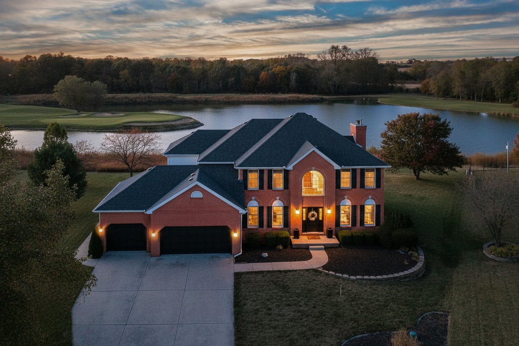 This stunning home offers gorgeous views of holes 5 and 6 of the Den at Fox Creek, an Arnold Palmer signature golf course, awaits you from this stunning home on the lake. Located on a quiet cul-de-sac, this east-facing home offers magnificent golf course and lake views with vibrant sunsets to the west. With over 5,100 square feet of living space, this 5-bedroom 4.5 bathroom home offers luxury and versatility, including a completely redone walkout basement that feels like its own home (serves as a full mother-in-law suite)-featuring a full kitchen, washer/dryer, living room with decorative fireplace and heat, bedroom, en-suite bathroom with LED mirror, office space, French doors to the walkout patio, an added 100-amp service to enhance the upgrades, and all-new recessed lighting. Upstairs, the huge primary suite boasts French doors, a jetted tub, and a huge separate sitting room. The main floor kitchen has plenty of gorgeous cabinets, hard surface countertops, and even a pantry. The main floor looks stunning with all of the crown molding. Enjoy breathtaking sunsets from the deck, four seasons room, or large patio, perfect for entertaining or relaxing by an evening fire. Recent updates include a new roof (2015), fresh paint throughout (2021 & 2023), granite countertops and laundry refresh (2023), tankless water heater (2024), and radon mitigation system (2021). Comfort is ensured with two new furnaces (2024 & 2025) and two new A/C units (2023 & 2025) serving both the upper and main/basement levels. The garage boasts an extra-deep stall ideal for a workshop or 4th vehicle, and shelving galore. Set up a showing to see this amazing home before it is gone.